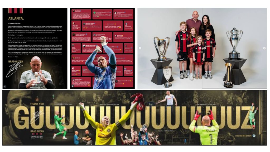 Following the video, Brad posted a letter he wrote to the Atlanta United fans around the world, and we then followed with an evolved look and thematic for the club’s “Thank You” graphics that our graphic designers developed using the traditional “Guuuuuz” chant from fans every time his name was announced over the stadium’s PA when announcing the starting eleven lineup. We also worked with our team photographers to plan a photoshoot that involved Brad, all the trophies he won with the club, and more importantly his family. We followed up with a graphic composition that included tweets, and comments from other players and clubs around the world reacting to Brad’s retirement, while also showing them as a brick wall, as Brad is affectionately called.